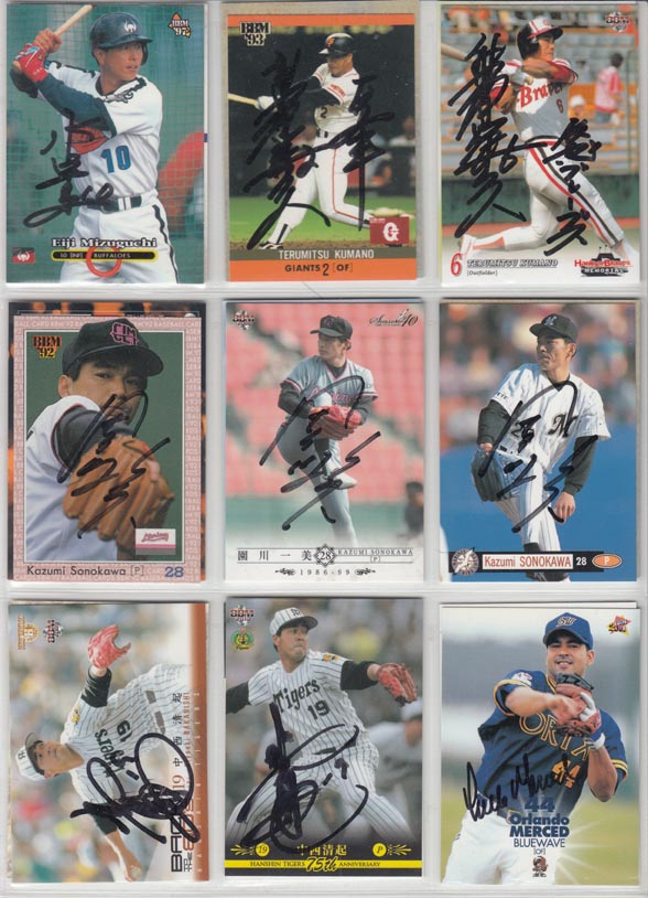 左上から。近鉄水口さん。少年野球教室を開いているそうです。この方もロサンジェルスオリンピックで主将で金メダルの熊野さん。阪急のあとジャイアンツに移籍したんですね。イチローに200本安打を打たれた園川さん。3枚もサインをいただきました。阪神中西球道君。昨年の甲子園での始球式でもいい球投げていましたね。そしてオリックスオーランドマルセド。今でもサインをくれるいい人です。