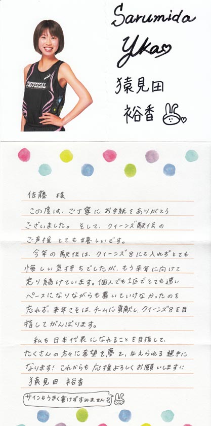 とても丁寧な手紙をいただきました。ありがたいですね。クイーンズ駅伝では16位と、今年もプリンセス駅伝からですねぇ。猿見田さんは1区で走っていましたね。まだまだ発展途上のチームなので頑張ってください。