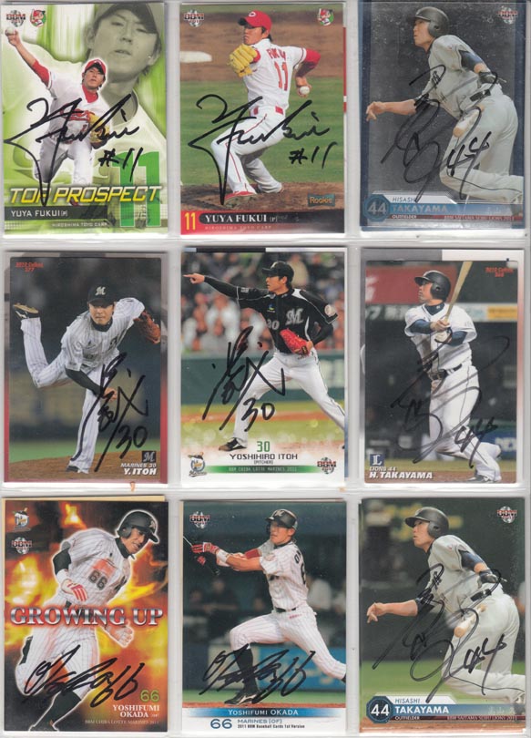 今回は上から、楽天イーグルスの元広島の福井優也さん。早稲田大学のドラフト1位でしたなぁ。その下は現在東福岡高校の体育教師をしていらっしゃる元ロッテの伊藤義弘さん、日ハムの陽さんの折れたバットが足に突き刺さった投手でしたな。現在は栃木ゴールデンブレーブスコーチの元ロッテ岡田幸文さん。横の縦2枚は元西武阪神の高山久さん。
