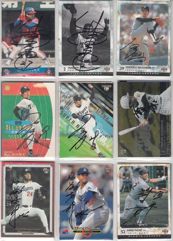 今回は上から、元西鉄阪神の竹之内雅史さん。バッティングフォームが独特でした。その隣は阪神の益山性旭さん。現在は戦国料理本陣で焼き鳥屋さんを営んでいるそうです。真ん中は元ヤンキース阪神の井川慶さん。あのまま阪神にいたらレジェンドだったのになぁ。その隣は阪神の北村照文さん。現在は社会人チームのコーチだそうです。下は元中日の佐藤秀樹さん。阪神のスコアラーですね。最後はジャイアンツのファームディレクターの井上真二さん。