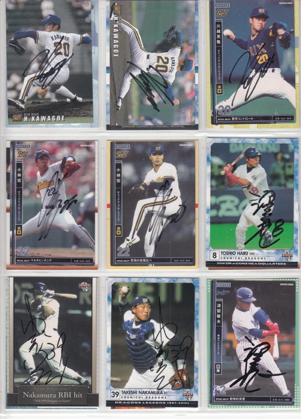 今回は上から、カルビーのカードにサインをしていただいた、現ロッテコーチの川越英隆さん。現在オリックス監督代行をしている小林宏さん。小林オマリーの14球の小林さんです。その下は中尾さんを正捕手から落とした中村武志さん。よく星野監督に怒られていたね。最後縦2枚はハマの核弾頭、波留敏夫さん。現在は中日の2軍コーチです。