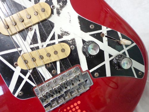 | 故エディバンヘイレンさん風のピックガードもかなり弾きこんだと見えて剥げちゃってます。このギターは本当に鳴らなかったんですが、ピックガードをとってみるとジャックのところの配線がねじれて切れていました。そりゃぁなりませんわな。 |