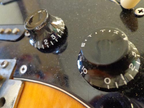 | コントローラーノブ。こんなつるつるしたノブってあるかなぁ。と思うほど今く回らない。きっと白だったんで黒色にしたかったんだろうな。かっこ悪いとは言わないけど。まぁ古いギターだし。 |