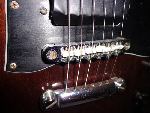 | ね、ビニールテープで巻いてある。これは前のオーナーがそうしたものです。ノイズ対策なのか、見た目なのか。わかりませんが、弾く時ビニールテープの角が当たっていたい。でも上手に巻いてあります。ちょっとめくってみたら普通のPUがついていました。 |