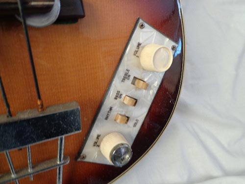 | それを詳しく見てみよう。本家のコントロールノブはティーカップと言われるお椀のような形。グレコはそこまで似せてない。トレブルとベースは入れるか入れないか、ってだけ見たい。ノブはフロントとリアのPUの出力っぽい。 |
