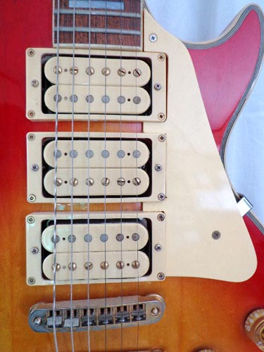 | このギターの工夫はですね、なんといってもピックガードです。よーくみてください。センターPUのところにも切れ込みがあるでしょ。普通のはフロントにだけ切れ込みがあってあとはストンってなってんのよ。でも本家エースフレーリーさんは3つとも切れ込みが入っているので、新しいピックガードを購入して3つの切れ目を入れたと、言っておりました。さすがババサン。 |