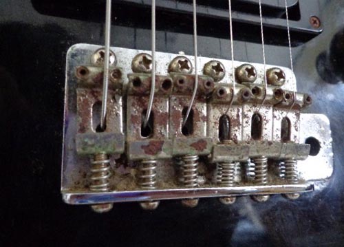 | んでサビサビのブリッジ。でもオクターブチューニングはほぼあっているし、痛くないし、このままでいいかなぁ。人前で弾くこともないし。 |
