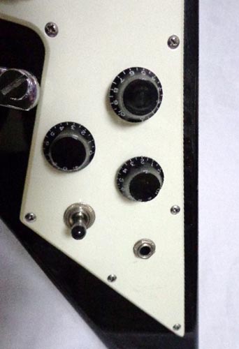 | 訳ありその1。なんでカバーがついたPUなのか?今時珍しいぞフライングVにカバー付PUは。断線したのかな。そんなにいい音しないから普通のマイクだと思う。 |