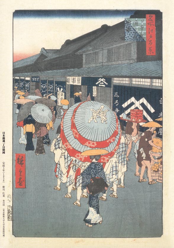 お店は白木屋と書いてありますね。江戸三大呉服店のひとつで、日本橋一丁目にあったそうです。白木屋乗っ取り事件とかあって、昭和になって東急百貨店になったそうです。それも1999年に336年の歴史に幕を閉じ、現在はコレド日本橋っていうのになっているそうです。複合施設って書いてありました。この画は顔がはっきりと書かれていないんですね。暑さを表現したかったからだそうです。なるほどね。