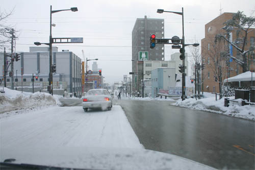 中央通り、北4条通り交差点。写真奥は北見駅。