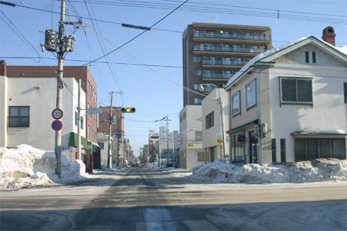 南岸通り、とん田通り交差点。交差点の向こうは、野付牛自動車学校。