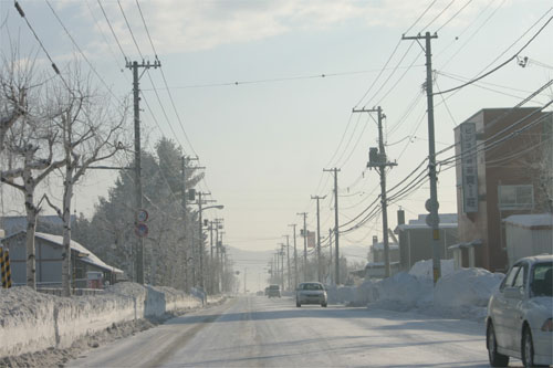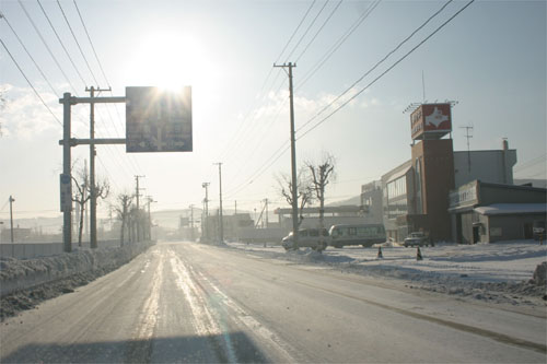 道路の向こうは野付牛自動車学校の教習コース