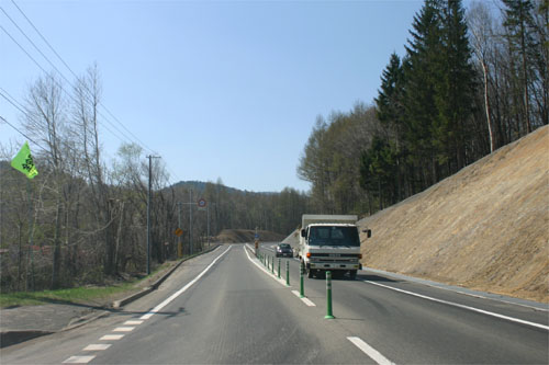 午前9時過ぎ、新しく中央分離帯が設置された国道242号、置戸町下鉱山バス停付近