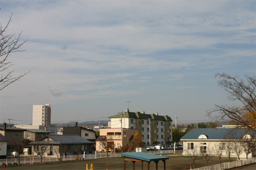 常呂川左岸堤防から、のつけ乃湯横の小石川沿い通りへ