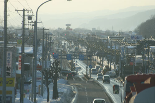 京セラ北見工場正面入口前の通りから南岸通りの交差点方向