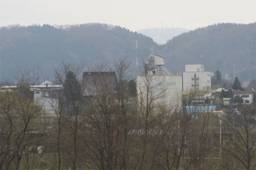 午後3時過ぎ、香ゃんせ公園から吊り橋で右岸堤防に渡り、そこから眺めた春光町方向