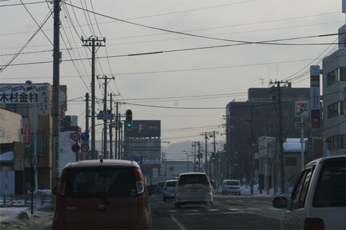 とん田通り、南大通り交差点から北見中央病院方向