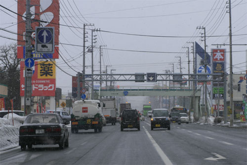 国道39号、三輪の交番前からメッセ前の交差点方向