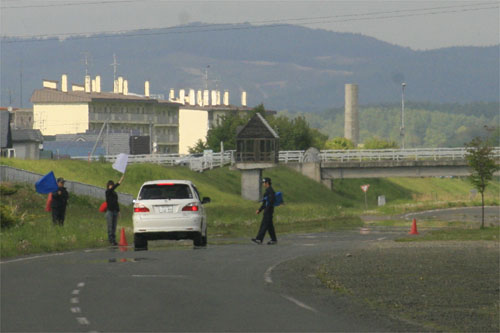 公園内の道路で、交通誘導員の講習中