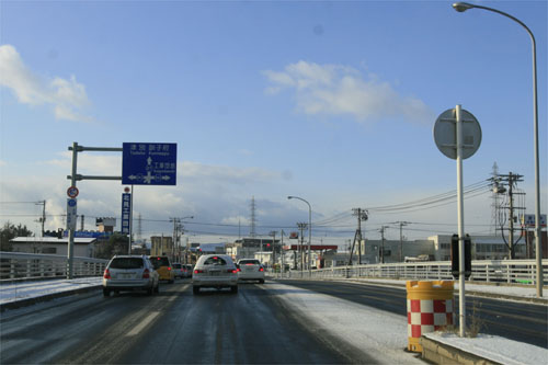 午前8時過ぎ、とん田通り、無加川橋を渡って錦町の南岸通りとの交差点