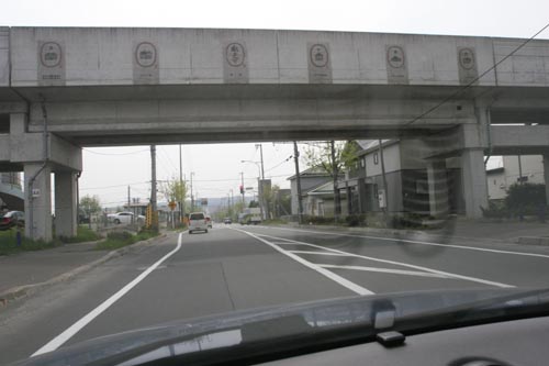高架橋壁面に貼ってあるのは北見市の版画家・香川軍男(ときお)さんの版画