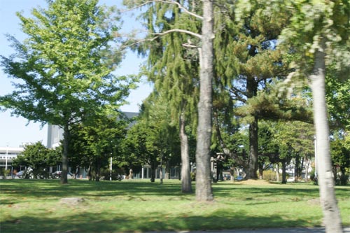 常盤通りの五差路から右、奥に見える赤い屋根が北見ハッカ記念館