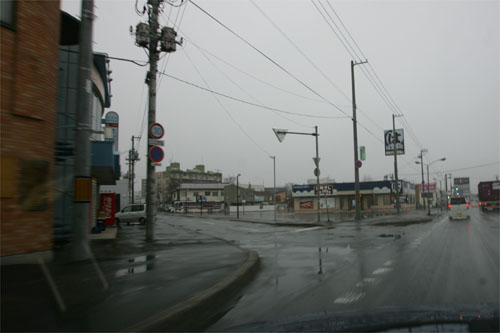 西5号線を挟んで左が無加川町、右が末広町、写真奥が無加川の堤防