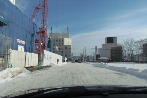 東1丁目通りの北見赤十字病院の新築現場前