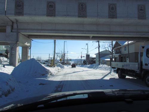 前方がJR石北本線高架橋、写真右が北見駅方向