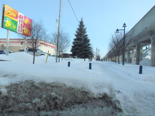 前方がJR石北本線高架橋、写真右が北見駅方向
