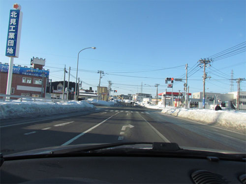 右折すると野付牛自動車学校、写真奥が訓子府・置戸・足寄方面