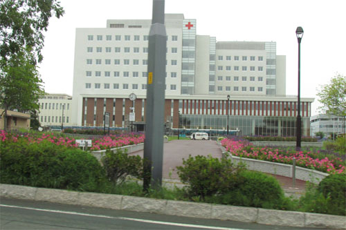 小公園とその奥に新しくなく北見赤十字病院の建物