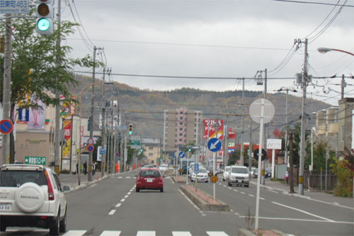 とん田通り、北見中央病院側から南大通り交差点方向