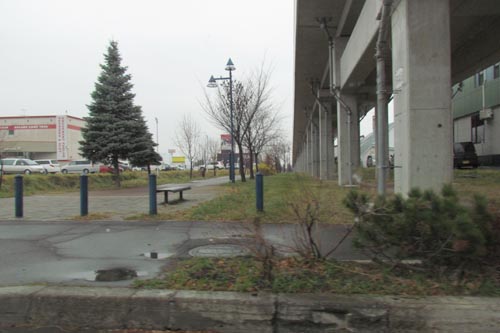 前方がJR石北本線高架橋、写真右が北見駅方向