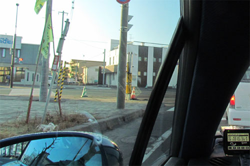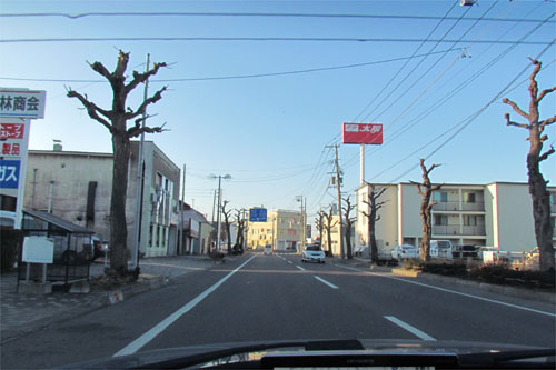 道路の向こう、左がオーディオのヤマデン、右が寺前歯科