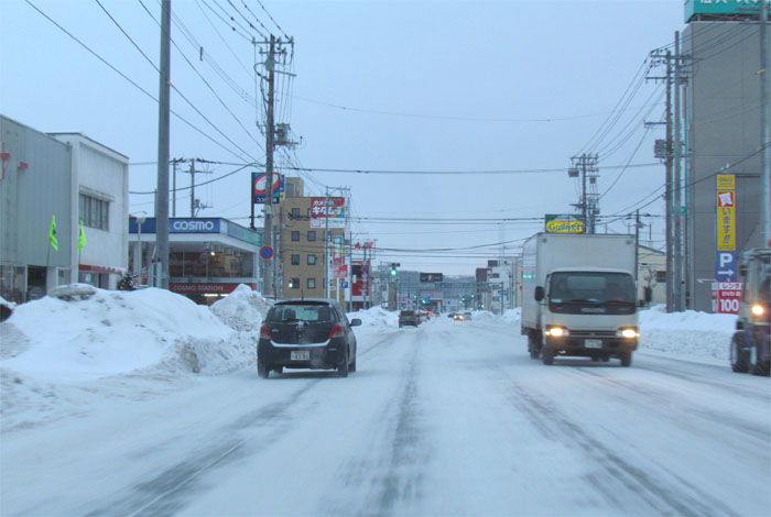 末広町の南岸通り、西4号線バス停前から野付牛自動車学校方向