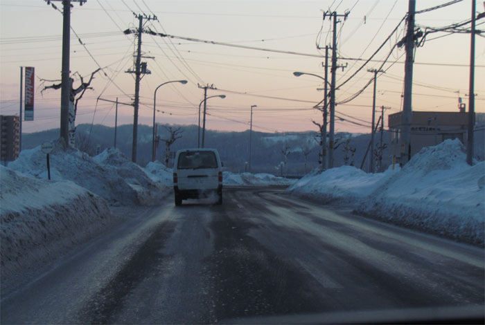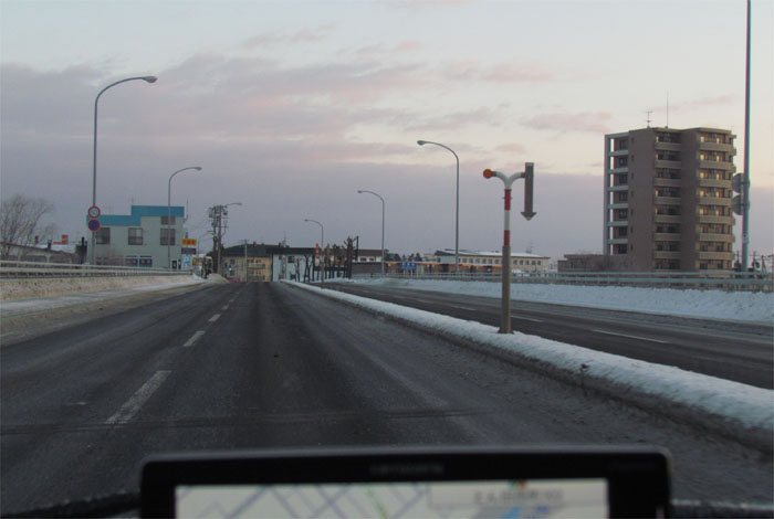 末広町の南岸通り、西4号線バス停前から野付牛自動車学校方向