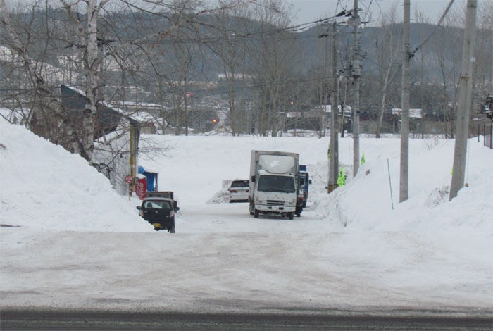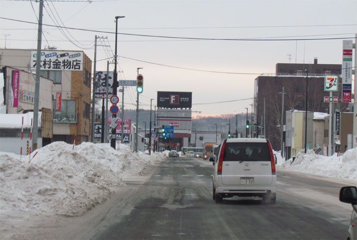 末広町の南岸通り、西4号線バス停前から野付牛自動車学校方向