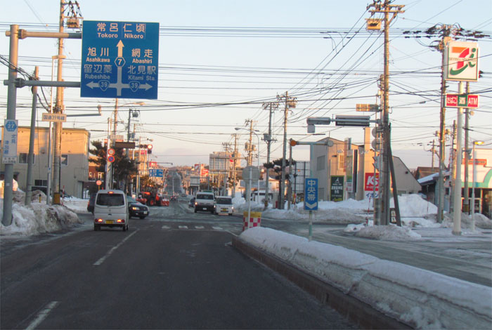 末広町の南岸通り、西4号線バス停前から野付牛自動車学校方向