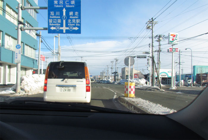 末広町の南岸通り、西4号線バス停前から野付牛自動車学校方向