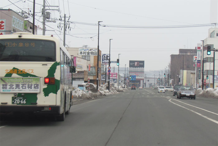 末広町の南岸通り、西4号線バス停前から野付牛自動車学校方向