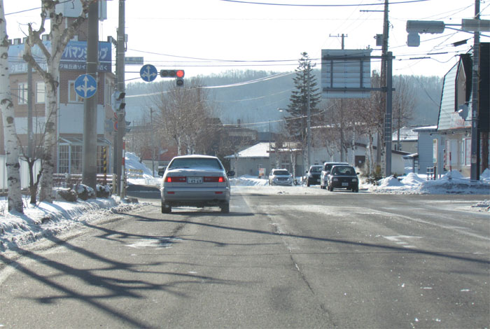 末広町の南岸通り、西4号線バス停前から野付牛自動車学校方向