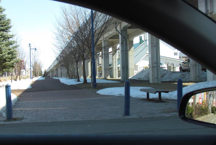 前方がJR石北本線高架橋、写真右が北見駅方向