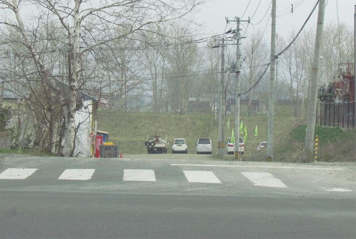 交差点から奥が無加川の右岸堤防で、写真奥が国道39号方向