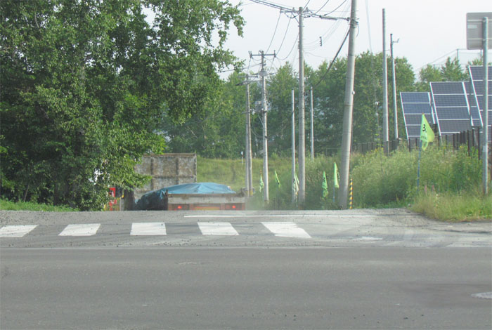 交差点から奥が無加川の右岸堤防で、写真奥が国道39号方向