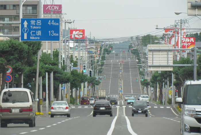 末広町の南岸通り、西4号線バス停前から野付牛自動車学校方向