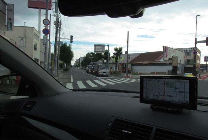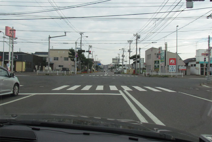 南岸通り、野付牛自動車学校前、奥がとん田通りの交差点