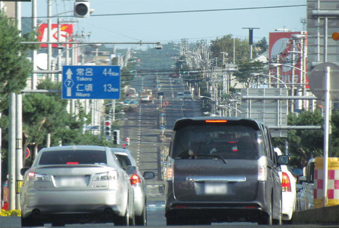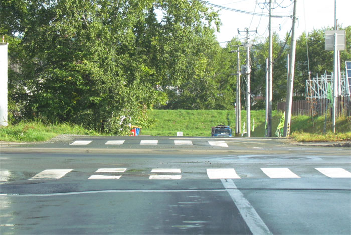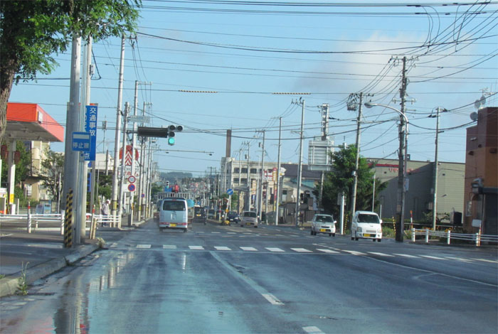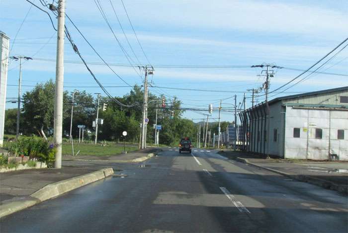 南岸通り、野付牛自動車学校前、奥がとん田通りの交差点