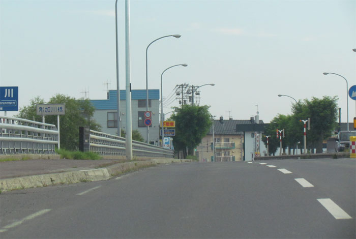 交差点から奥が無加川の右岸堤防で、写真奥が国道39号方向