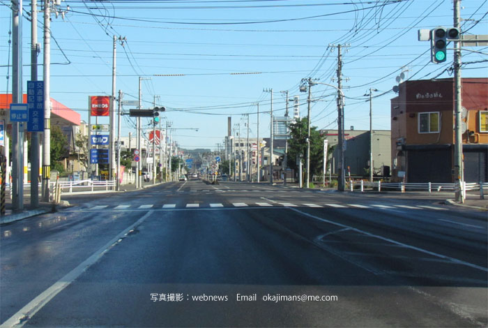 南岸通り、野付牛自動車学校前、奥がとん田通りの交差点